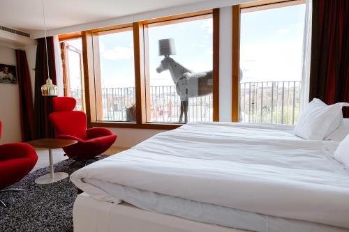 Extra spacious room with handmade, designer rugs by Kasthall and floor-to-ceiling windows overlooking Kungsportsplatsen Square.